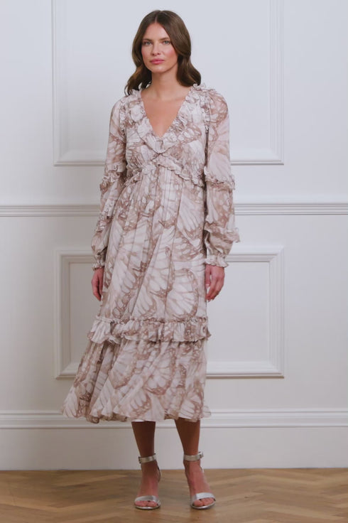 The Flutter Chiffon Long Sleeve Ballerina Dress in Chestnut features a hand-painted watercolour butterfly print, with soft motifs that vary in scale. Made from semi-sheer chiffon, this flowing, easy-fit dress is fully lined for comfort. Crafted with signature Needle & Thread ruffles adorn the neckline, shoulders, and bust seam, while the gathered skirt hem with a top-stitched frill adds a whimsical touch. Developed with blouson sleeves, finished with delicate gathered frills and elasticated cuffs, complete the look. A timeless addition to your wardrobe.