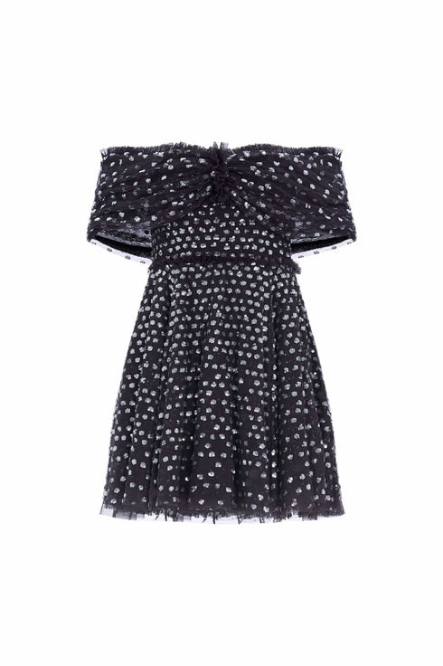 The Grace Gloss Off-Shoulder Micro Mini Dress in Graphite / Silver. This dress is beautifully decorated with high-shine sequins in dot motifs creating an enchanting, shimmery effect. Crafted with an off-the-shoulder design inspired by iconic Grace Kelly, capturing the elegance of her look perfectly. Designed with an integrated corset for the perfect shape and structure. You'll forever treasure the Grace Gloss.