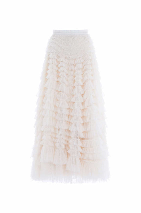 The Hattie Ruffle Skirt in Cream. This textile skirt is engineered with layers of soft tulle and net to create a signature Needle & Thread style. Crafted with individual ruffles to create a beautiful, frilly texture. Designed with a sweeping hemline and finished at the waist with a satin ribbon for extra detail. We recommend pairing this skirt with our knitwear for a romantic Needle & Thread look.