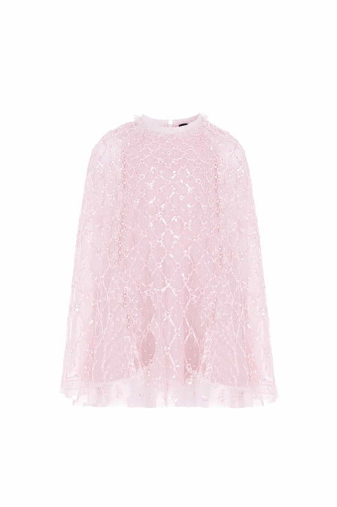NEW SEASON | NEEDLE & THREAD EXCLUSIVE. The Heart Lattice Cape KIDS Dress in Dusk Pink. A brand new style for the season ahead. This KIDS cape dress is adorned with intricate embellishment, created using the smallest sequins for exquisite detailing. Featuring delicate heart-shaped motifs in a lattice layout. Beautifully developed with an integrated full-length cape for a statement look. A stunning dress for your little one's next event.