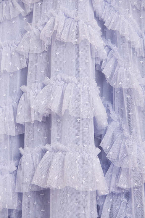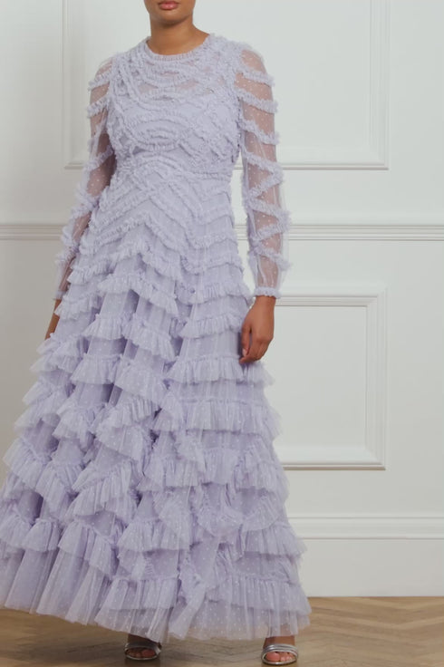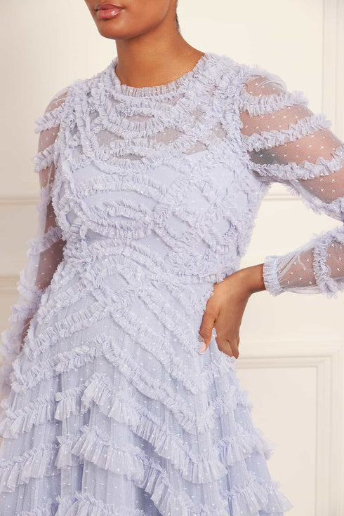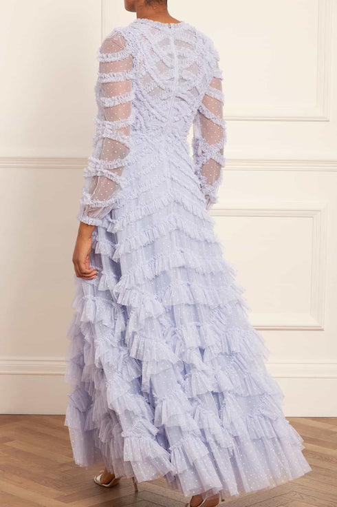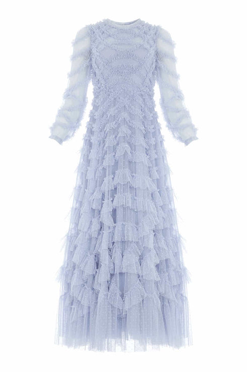 The Lana Round Neck Gown in Iris Blue. This beautiful gown is adorned with engineered tulle frills to create a romantic textile. Developed with a round neckline and long sleeves for an elegant look. Beautifully crafted with layers of soft tulle for a whimsical, statement texture. Expect all eyes on you in this magical Needle & Thread piece.