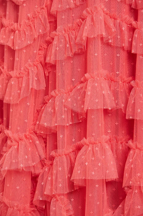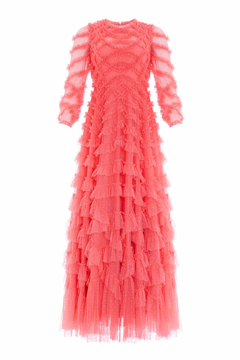 The Lana Round Neck Gown in Pink Sky. This beautiful gown is adorned and engineered with tulle frills to create a romantic textile. Developed with a round neck design and long sleeve for an elegant look. Beautifully crafted with layers of soft tulle for a whimsical, statement texture. Expect all eyes on you in this magical Needle & Thread piece.