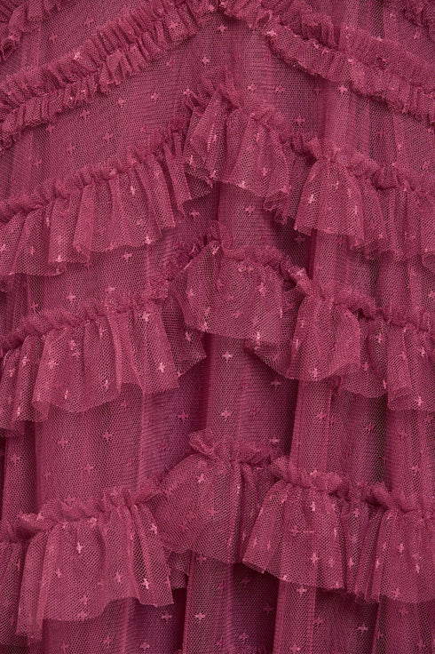 The Lana Round Neck Gown in Pink Topaz. This beautiful gown is adorned with engineered tulle frills to create a romantic textile. Developed with a round neckline and long sleeves for an elegant look. Beautifully crafted with layers of soft tulle for a whimsical, statement texture. Expect all eyes on you in this magical Needle & Thread piece.