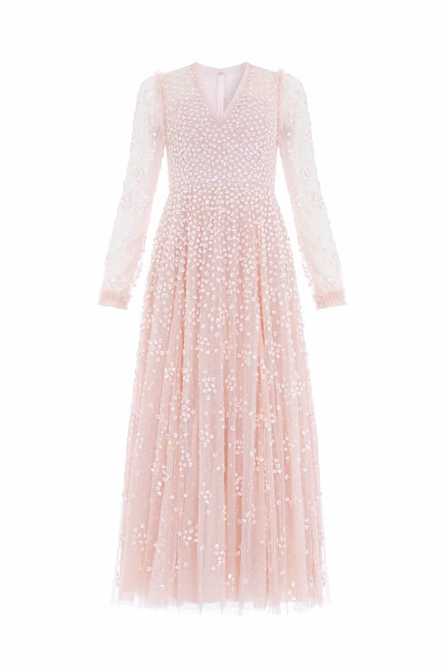 The Leila Dot V-Neck Ankle Gown in Pearl Pink is adorned with shimmering clustered dot motifs, creating a sparkling effect. This elegant V-neck gown features slim sleeves, with signature Needle & Thread tulle frills at the neckline and armholes. The skirt, crafted from layers of net and tulle, finishes with a sweeping hemline. A captivating design with dramatic flair.