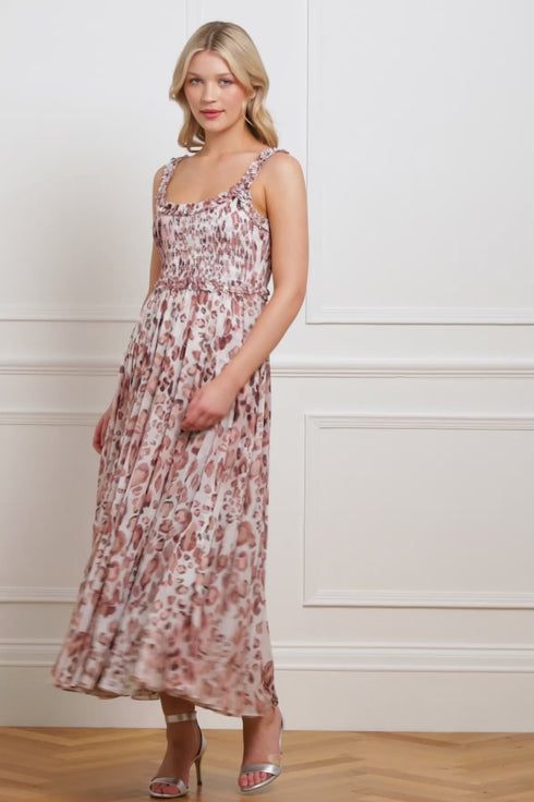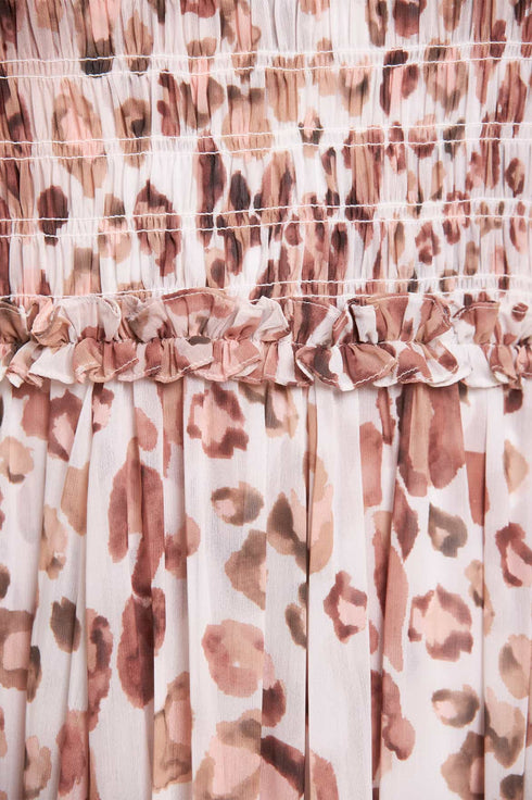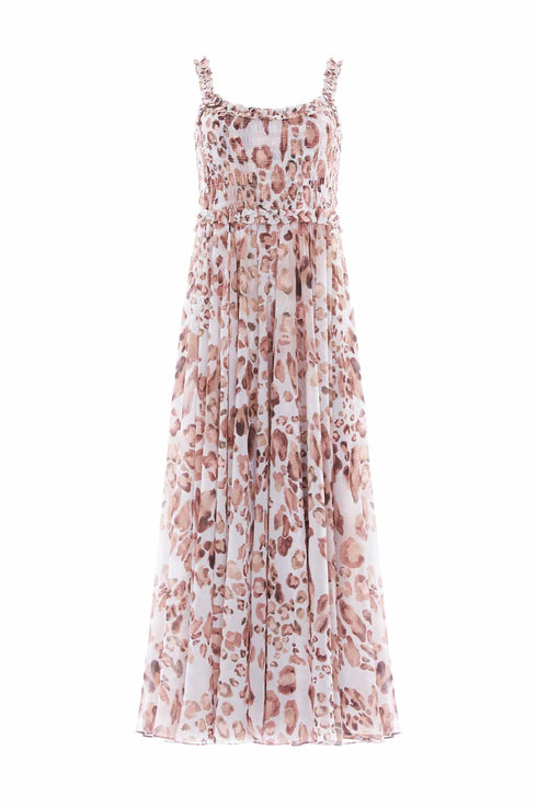 The Leopard Chiffon Smocked Cami Ankle Gown in Moonshine. This statement piece features a hand-painted leopard print, created in-house with watercolour techniques. The soft, fluid motifs vary in scale, with a beautifully watery definition. Crafted from the softest chiffon, the design showcases a shirred bodice, adorned with signature Needle & Thread frills at the neckline, shoulders, and waist. The cami straps are also decorated with frills for an added touch of elegance. The delicately gathered fluid skirt is fully lined, offering both comfort and graceful movement. A timeless piece, perfect for any occasion.