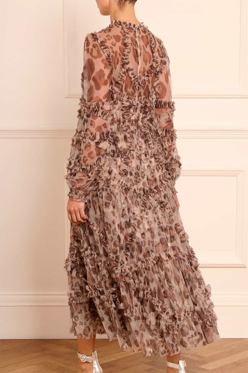 The Leopard Diamond Ruffle Ballerina Dress in Moonshine. This statement print was hand-painted in-house using watercolour, with soft leopard motifs varying in scale and featuring watery definition. Inspired by Victorian styling, this piece includes pretty engineered ruffle details and voluminous blouson sleeves with an elasticated cuff adorned with frill detailing. The skirt offers a flattering fit that skims the body and gently increases in fullness, creating stunning movement within the tulle. Make this piece your new wardrobe favourite.
