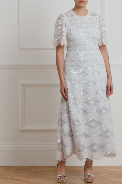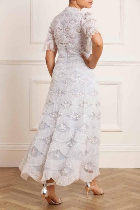 The Lunette Blossom Ankle Gown in Blue Mist This gorgeous gown is inspired by traditional Wedgwood ceramics, and is beautifully adorned with floral embroidery motifs, shimmering sequins and delicately gathered tulle scallop borders with contrasting ivory detail. Designed with pretty fluted sleeves, a flattering silhouette and a romantic aesthetic throughout. The perfect gown to take you from day to night.