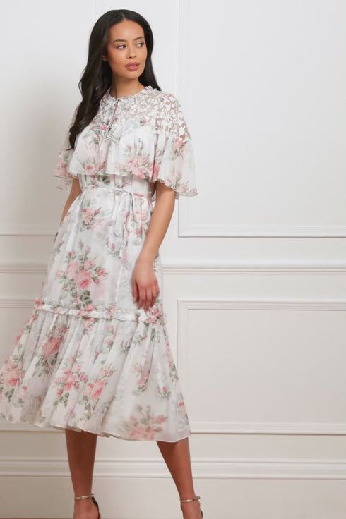 The Madame Rose Carla Chiffon Cape Ballerina Dress in Moonshine. This ethereal dress features an exquisite 1850s-inspired print, showcasing luxurious rose bouquets and intricate scroll details. Crafted from the softest chiffon, it is enhanced by printed tulle panels at the yoke and sleeve head, embroidered with delicate floral motifs. A short integrated cape with a frill tier adds a dramatic yet romantic touch, while the neckline and cape are adorned with signature Needle & Thread frills, finished with tiny pin hems. The softly gathered skirt hem tier is decorated with a chiffon ruffle, completing the graceful silhouette. A slim self-fabric waist tie offers versatility, allowing for a personalised fit.
