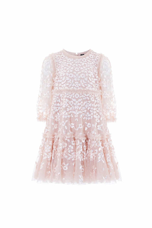NEEDLE & THREAD EXCLUSIVE. The Maeva Long Sleeve Kids Dress in Pearl Pink is a Needle & Thread exclusive, featuring floral sequin motifs on the bodice and trailing floral borders fading towards the hem. Designed with foil-coated sequins add a lustrous shine, while the gathered skirt tier with a frothy ruffle gives it volume for twirling. Delicate tulle frills at the neckline, shoulders, and yoke complete this timeless, heritage-inspired design.