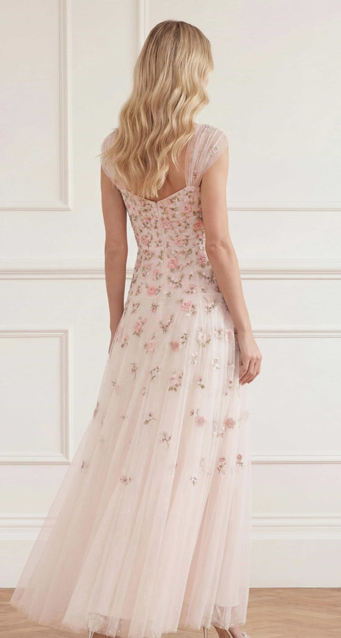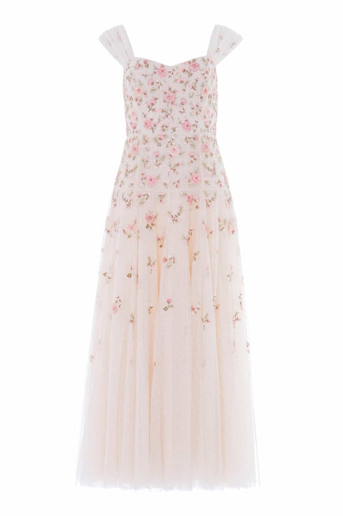 NEW SEASON. The Mayflower Ditsy Ankle Gown in Cream. Adorned with luxurious cascading floral embroidery that gradually trails towards the hem, this ankle gown captures the romance of late summer blooms. Designed with softly gathered tulle straps and a sweetheart neckline, the skirt features a yoke seam with volume falling below for a flattering, frothy effect.