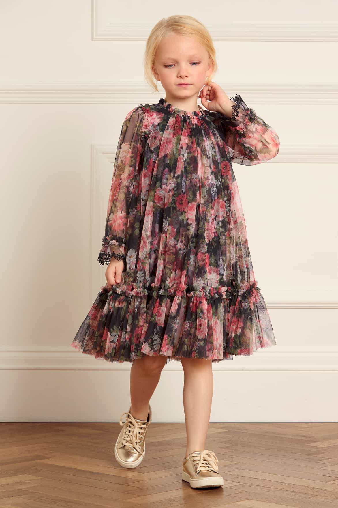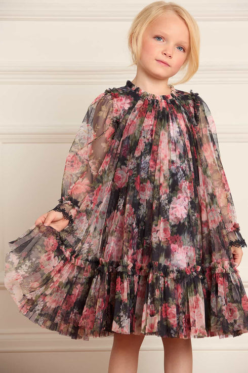 The Midnight Dance Long Sleeve Kids Dress in Graphite. This dress is beautifully printed with a decadent floral print featuring luxurious blooms taken from archive, hand painted artwork from the early 1900’s. Beautifully developed with a playful trapeze style silhouette and elasticated cuffs with delicate lace trim edging. This dress will transport them to a Winter Wonderland.