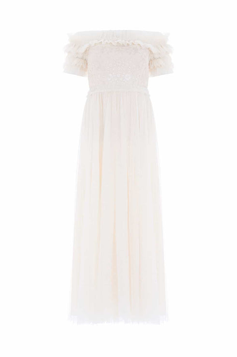 The Midsummer Lace Bodice Off Shoulder Ankle Gown in Cream. This gown is an update of our bestselling signature style. Beautifully developed with layers of soft, delicate tulle and an off-the-shoulder shape to create a romantic silhouette. The bodice is scattered with vintage-inspired embroidered motifs for a signature Needle & Thread look. The perfect style for a bridesmaid or special event.