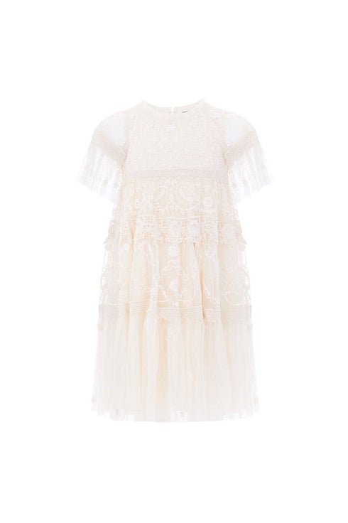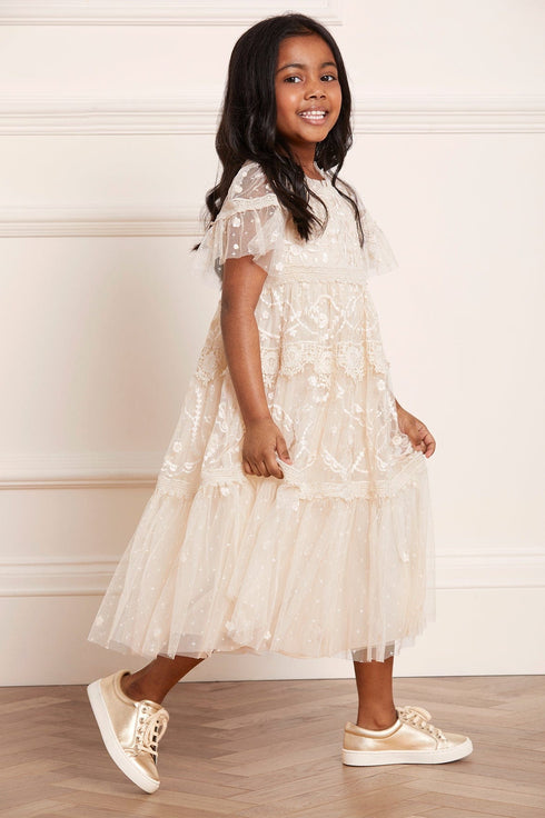 NEW SEASON | The Midsummer Lace KIDS Dress in Champagne. This dress is designed beautifully with scattered floral motifs. Features intricate scallop border designs in champagne embroidery threads on delicate kisses tulle. This embroidered lace dress has short cap sleeves and a multi-layered tulle skirt with frill detailing. The Midsummer Dress is fit for a princess.
