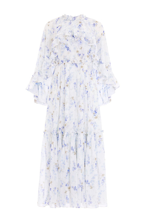 The Ophelia Ditsy Harper Chiffon Cape Ankle Gown in Moonshine/Blue. This romantic trailing print is taken from an archive, hand-painted artwork from the early 1900s, depicting soft, whimsical ditsy floating florals. This gown features a dramatic yet elegant cape which has a detachable fastening for versatile styling. Developed in the softest chiffon for a romantic flowing silhouette. The perfect gown to take you from day to night.