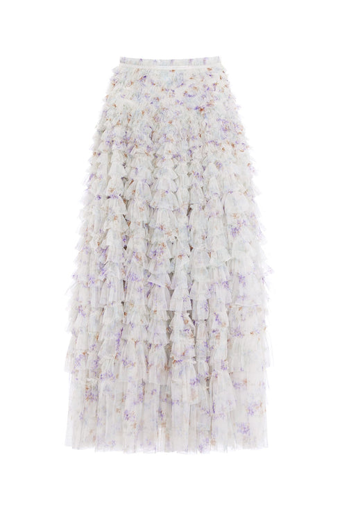 The Ophelia Ditsy Hattie Ruffle Ankle Skirt in Moonshine/Blue. This romantic trailing print is taken from an archive, hand-painted artwork from the early 1900s, depicting soft, whimsical ditsy floating florals. Crafted with individual ruffles to create a beautiful, frilly texture. Designed with a sweeping hemline and finished at the waist with a satin ribbon for extra detail. We recommend pairing this skirt with our Embellished V-Neck Short Cardigan for a romantic Needle & Thread look.