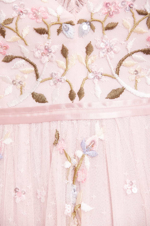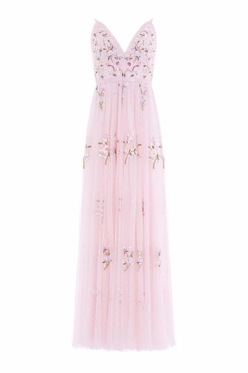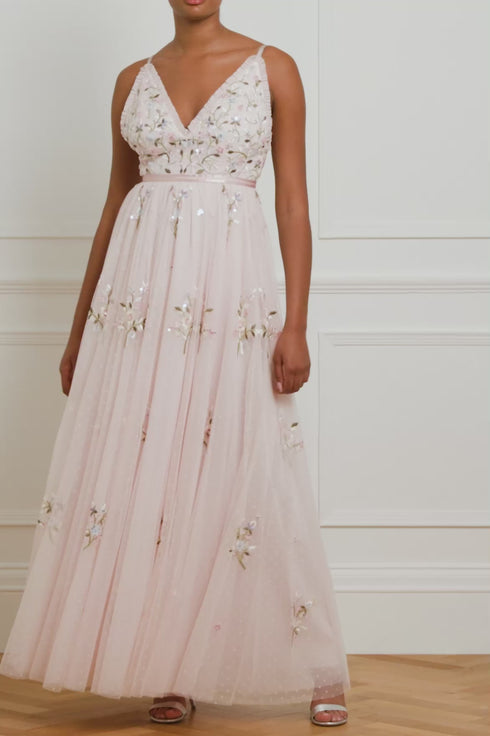 The Petunia Cami Gown in Peony Pink. Inspired by Edwardian vintage artwork, this elegant gown is designed with rich embroidered bouquets of delicate florals in soft, pastel shades and subtle, vibrant green highlights. Shimmering iridescent sequins scattered throughout add a glistening effect to the piece. Intricately cut with fine, delicate tulle ruffles trimming the neckline and a voluminous skirt that features a net under layer to hold the shape and create a romantic silhouette. The ultimate fairytale style.