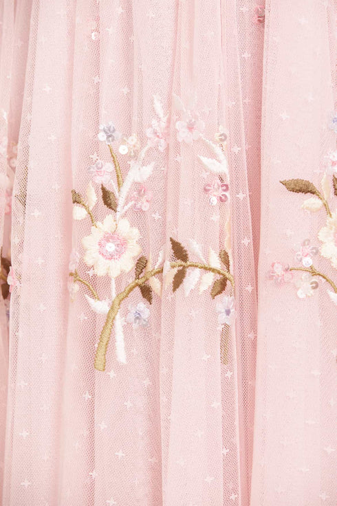 The Petunia Cap Sleeve Gown in Peony Pink. Inspired by Edwardian vintage artwork, this elegant gown is designed with rich embroidered bouquets of delicate florals in soft, pastel shades and subtle, vibrant green highlights. Shimmering iridescent sequins scattered throughout add a glistening effect to the piece. Intricately cut with fine, delicate tulle ruffles trimming the neckline and a voluminous skirt that features a net under layer to hold the shape and create a romantic silhouette. The ultimate fairytale style.