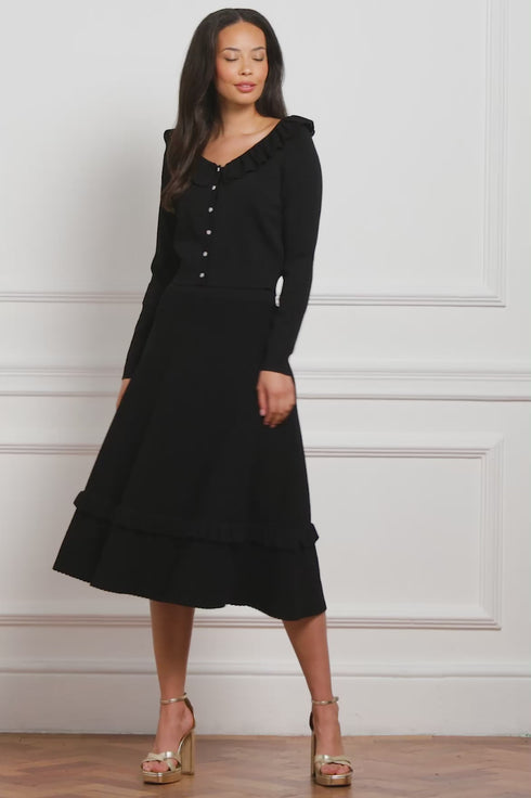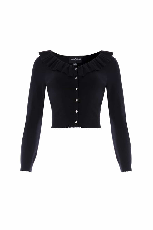 NEW SEASON. The Pointelle Trim Knit Short Cardigan in Graphite. A contemporary knit with romantic handwriting, this piece is crafted in a soft yarn blend with delicate pointelle stitchwork. Decorative trims reference Victorian craftsmanship, while the cropped length and slim fit keep the silhouette modern. Layered over gowns or styled with its matching skirt, this versatile cardigan grounds delicate detail with sophistication.