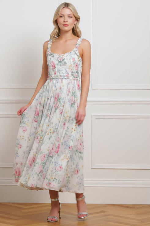 The Pompadour Garden Chiffon Smocked Cami Ankle Gown in Moonshine. This elegant dress is inspired by the opulent wall coverings of the Palace of Versailles, featuring hand-painted floral bouquets and trailing ditsy motifs for a regal touch. Crafted from the softest chiffon, it showcases a shirred bodice adorned with signature Needle & Thread frills at the neckline, shoulders, and waist. The cami straps are decorated with delicate frills, while the softly gathered skirt flows gracefully and is fully lined for added comfort and luxury.