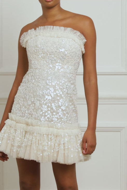 The Regal Rose Gloss Strapless Micro Mini Dress in Cream. The Regal Rose is decorated with elegant, floral artwork featuring delicate lace. This dress is developed with a fitted corset bodice and then flows into a dramatic, voluminous skirt. The integrated corset is made with ribbon stitching, soft boning and panels of stretch mesh fabric for comfort and security in the fit. The perfect dress for a special moment.