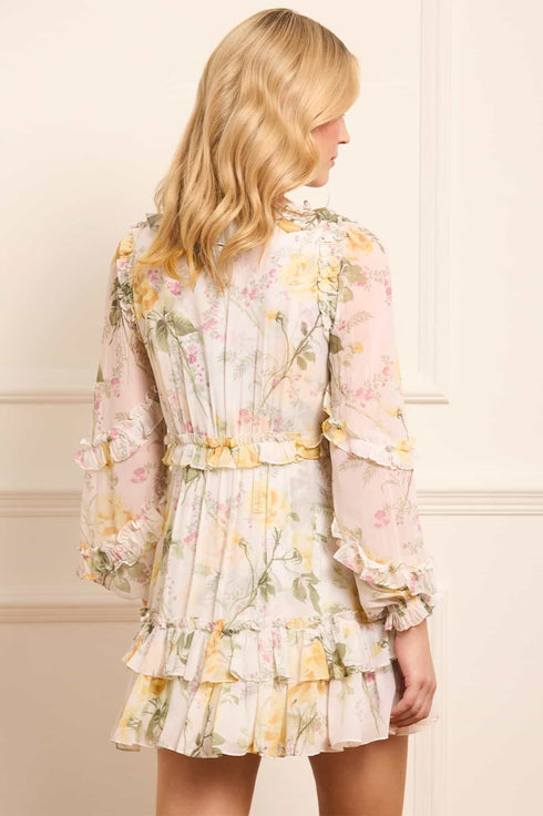 The Rose Chiffon Long Sleeve Micro Mini Dress in Moonshine/Yellow features a romantic print inspired by antique hand-painted artwork from the early 1900s, with large rose blooms and trailing florals. Made from soft semi-sheer chiffon, this easy-fit, fully lined dress is adorned with signature Needle & Thread ruffles at the neckline, shoulder, and bust seam. The gathered skirt hem is finished with a topstitched frill, while the blouson sleeves feature delicate gathered frills, ending in elasticated cuffs for a whimsical touch.