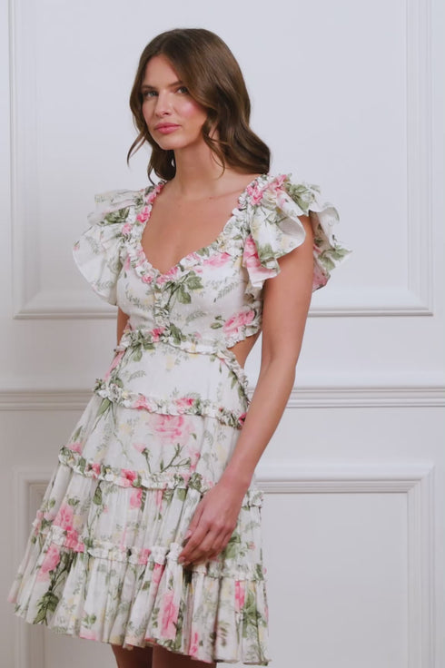 The Rose Cotton Backless Mini Dress in Moonshine/Pink features a romantic print inspired by antique hand-painted artwork, with large rose blooms and trailing florals. Designed with a flattering open back and a button closure at the neck, this dress effortlessly transitions from day to night.