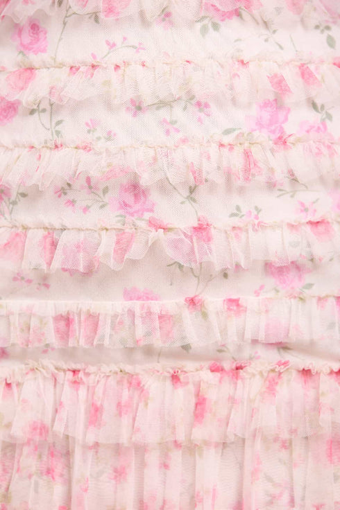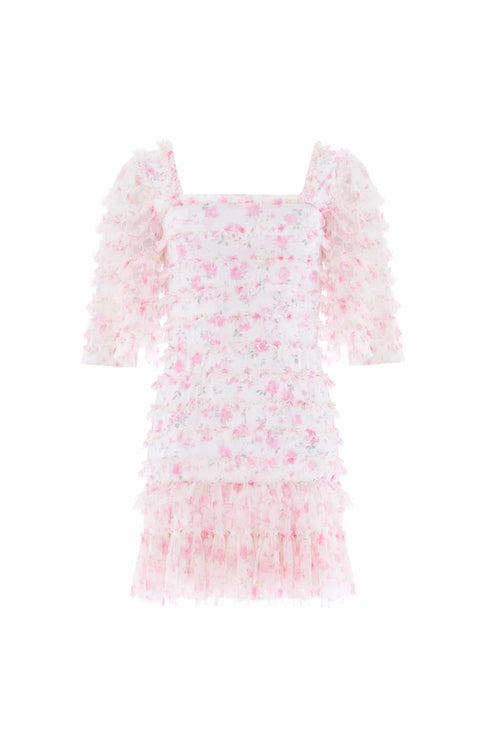 The Rose Ditsy Short Sleeve Micro Mini Dress in Moonshine/Pink. This gown features a romantic floral print inspired by 1800s hand-painted wallpaper. The slim silhouette is shaped with two layers of stretch power-mesh for comfort and support. Crafted with delicate tulle sleeves and skirt add to its ethereal charm, while signature Needle & Thread frills create a flattering, flowing effect. The square neckline, fluted sleeves, and gathered skirt bring elegance and timeless beauty to this gown. A piece you'll cherish forever.