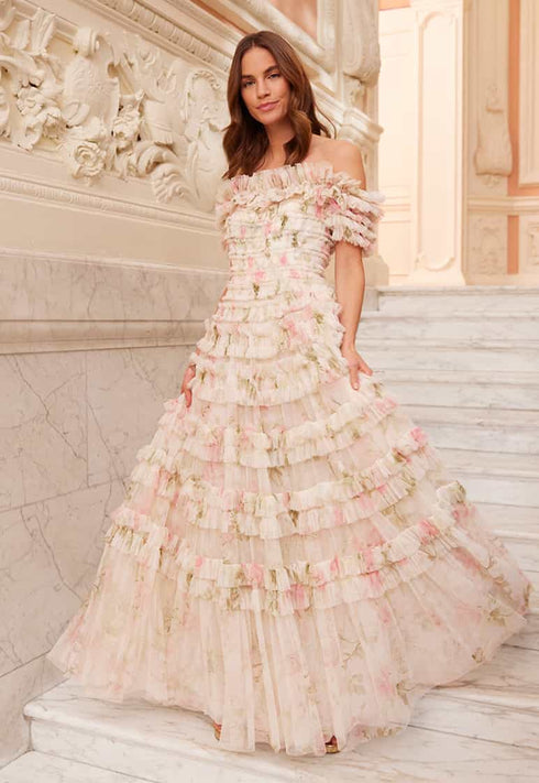 - Floral printed tulle decorated with layers of tulle ruffles.