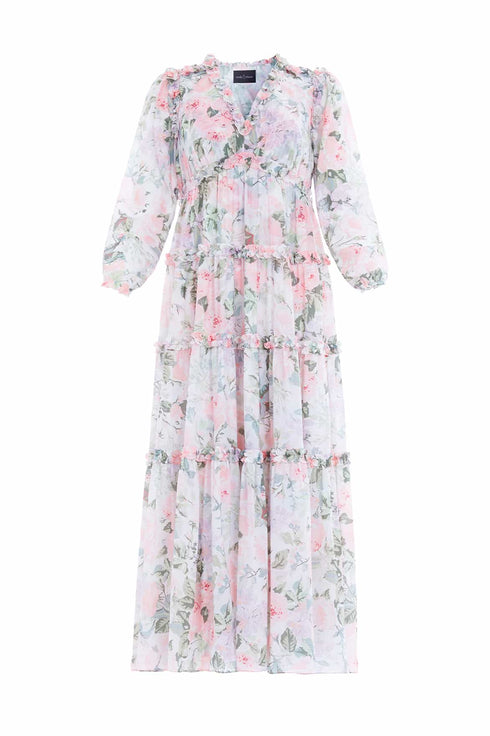 The Rose Powder Chiffon Ankle Gown in Moonshine. This gown is inspired by a 1900s hand-painted wallpaper design. Beautifully printed with florals in faded pastels for a vintage look. Developed with a soft chiffon fabric with a loose fitting silhouette for effortless styling. Designed with an upwards V-shaped waistline to create a flattering fit, gathered ruffles and skirt tiers for a signature Needle & Thread look. A versatile piece you'll forever cherish.