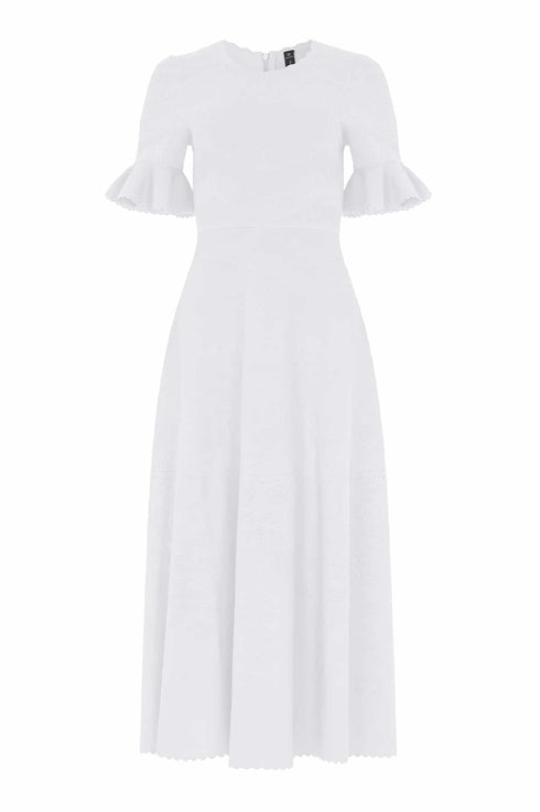 NEW SEASON. The Scallop Lace Pointelle Knit Gown in Cream. A graceful knit design with a scalloped neckline and soft lace detailing. Combining delicate craftsmanship and fluid drape, it offers a modern twist on timeless romance.