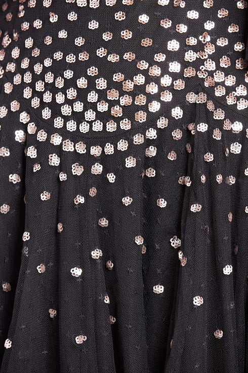NEW SEASON. The Scallop Sequin Round Neck Micro Mini Dress in Graphite/Metallic. Rows of metallic sequins create scallop motifs across graphite tulle, adding dimension and light play. The micro mini length makes this a statement piece, while the darker base brings sophistication. A modern party dress infused with the Bright Star collection’s cosmic inspiration.
