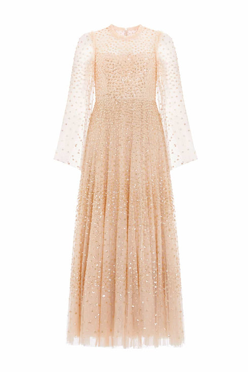 The Scatter Dot Round Neck Ankle Gown in Antique Gold. This embellished gown is decorated with exquisite shimmering dot motifs, undulating in wave formations for a captivating glittering effect. The round neck bodice is trimmed with signature Needle & Thread tulle trims at the neckline and shoulders for romantic detailing. The elegant long fluted sleeves are adorned with tiny sparkling sequin motifs, and the skirt is made up of generous layers of net and tulle with a sweeping hemline. This magical piece is perfect for an upcoming special occasion and beyond.