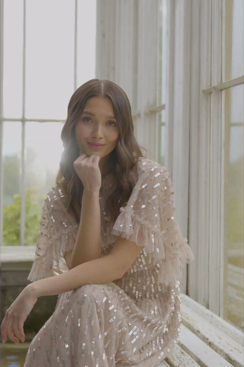 The Sequin Dash Cape Ankle Gown in Sand. This ankle length gown is adorned with statement, square sequins in a staggered linear layout creating a shimmer throughout. Developed with a loose silhouette for an effortless, floaty feel featuring voluminous sleeves for a romantic look. This gown features a layered cape design, which can be removed for versatile styling. The skirt is crafted with layers of net tulle creating movement as you walk. The perfect gown for an upcoming special occasion.