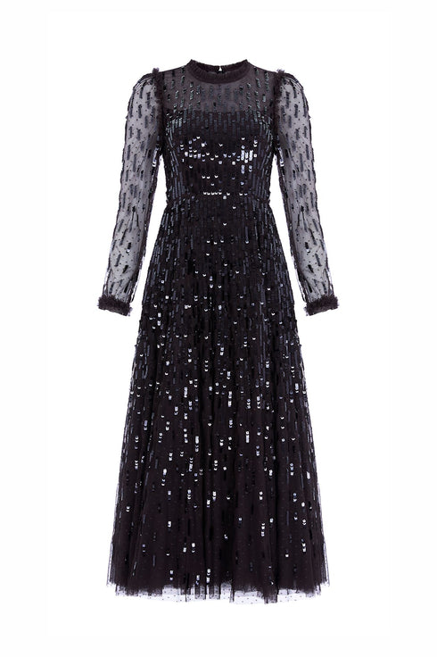 The Sequin Dash Long Sleeve Gown in Graphite. This ankle length gown is adorned with statement, square sequins in a staggered linear layout creating a shimmer throughout. Developed with a loose silhouette for an effortless, floaty feel featuring long sheer-sleeves for a romantic look. The perfect gown for an upcoming special occasion.