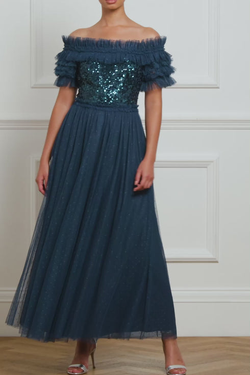 The Sequin Wreath Bodice Off-Shoulder Ankle Gown in Teal. This beautiful gown is crafted with an iconic off-the-shoulder design. Adorned with layers of delicate ruffles, along with an elasticated panel for comfort and hold. The bodice is beautifully decorated with shimmering sequins inspired by a vintage lace curtain. Designed with a romantic layered tulle skirt for signature Needle & Thread styling. A perfect gown for a special occasion.