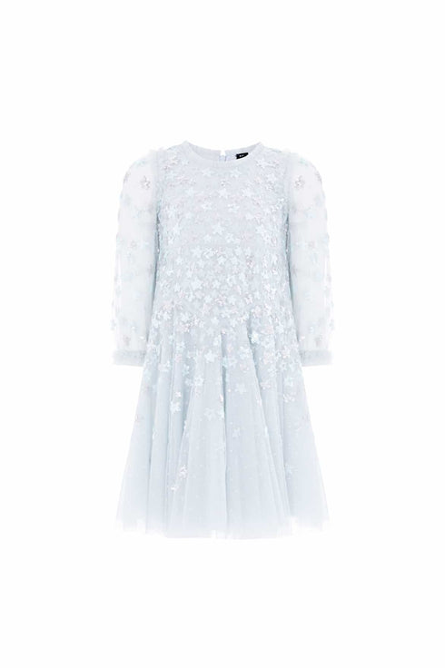 NEW SEASON. The Starry Nights Kids Dress in Ice Blue. Features twinkling star sequins cascading across soft tulle. With a full, gathered skirt and a gentle sparkle, it’s made for moments that feel truly magical. This dress pairs beautifully with the Starry Nights Round Neck Gown from the womenswear line for a timeless coordinated look.