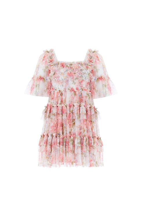 NEW SEASON | NEEDLE & THREAD EXCLUSIVE. The Summer Song Peaches Smocked Micro Mini Dress in Moonshine / Pink. This statement mini dress is beautifully printed with a romantic, floral artwork in sunset colours of dusk. Designed with playful layered tiers and frills, plus a full skirt for romantic movement. This mini features an elasticated smocked waist for comfort and pretty detailing and is beautifully crafted with short sleeves, tulle ruffles and a 'x' kiss motif throughout. The perfect dress to take you from day to night.