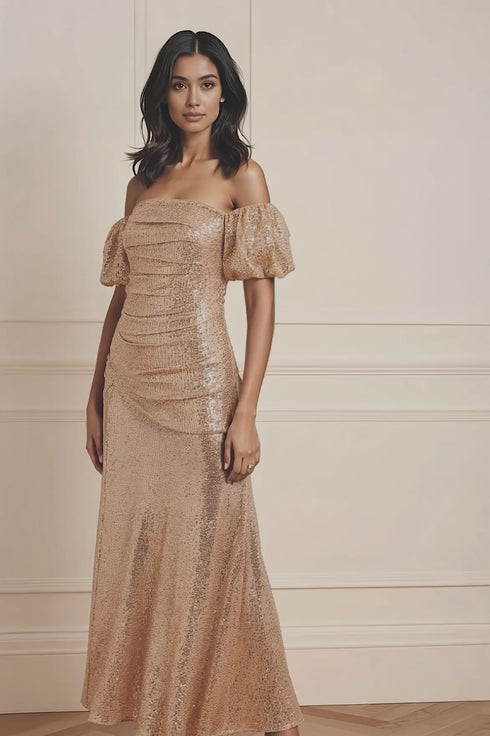 The Sunbeam Valentina Off-Shoulder Gown in Antique Gold. Turn heads in the dazzling gown. Featuring shimmering 3mm sequins on stretch mesh, an off-shoulder silhouette, and a fluid skirt, this design exudes timeless elegance. Crafted with romantic puff sleeves and soft draping flatter the figure, while an internal corset ensures comfort and support. Perfect for glamorous soirées, this gown promises unforgettable sophistication.