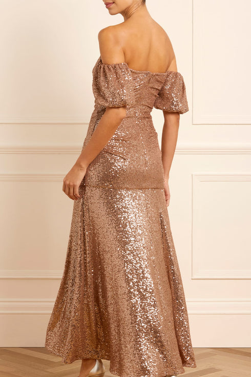 The Sunbeam Valentina Off-Shoulder Gown in Mocha. Turn heads in the dazzling gown. Featuring shimmering 3mm sequins on stretch mesh, an off-shoulder silhouette, and a fluid skirt, this design exudes timeless elegance. Crafted with romantic puff sleeves and soft draping flatter the figure, while an internal corset ensures comfort and support. Perfect for glamorous soirées, this gown promises unforgettable sophistication.