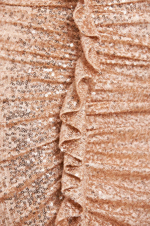 Meet the Sunray Sequin One-Shoulder Ballerina Dress in Metallic Gold. A brand new style for the season ahead. This dress is made from specially sourced sequin fabric, created using the tiniest sequins carefully stitched to the stretch mesh base, creating an all-over shimmering fabric. This one-shoulder dress is developed with a flattering silhouette using an expert technique featuring folded frill details for Needle & Thread signature elements. This style is fully lined in power mesh to create ultimate fit and comfort. The perfect piece to shine in golden hour.
