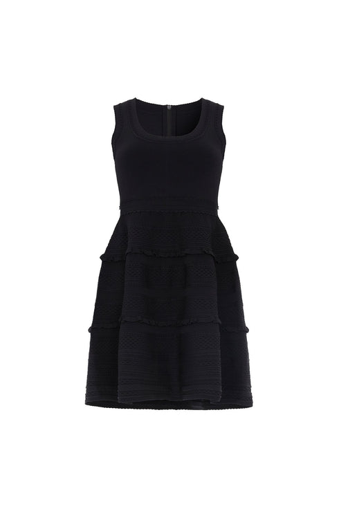 The Textured Knit Sleeveless Mini Dress in Black. This knitted dress is intricately designed with scallop and pointelle trims for signature Needle & Thread detailing. Beautifully developed from a stretch, yarn fabric that makes the dress easy to wear and comfortable. This sleeveless dress is adorned with perfectly placed knitted ruffles, lace cable details and a voluminous skirt. Make this dress your new wardrobe staple.