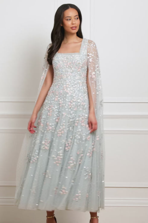 The Versailles Ditsy Cape Sleeve Ankle Gown in French Blue. Inspired by the opulence of Versailles, this gown features rich multicoloured floral embroidery across the bodice, trailing softly toward the hem. Decorated with high-shine sequin dot motifs add a touch of shimmer throughout. A square neckline trimmed with signature tulle frills and delicate embroidered cape sleeves enhance its romantic charm. Finished with a sweeping layered tulle skirt, this piece exudes elegance and grandeur.