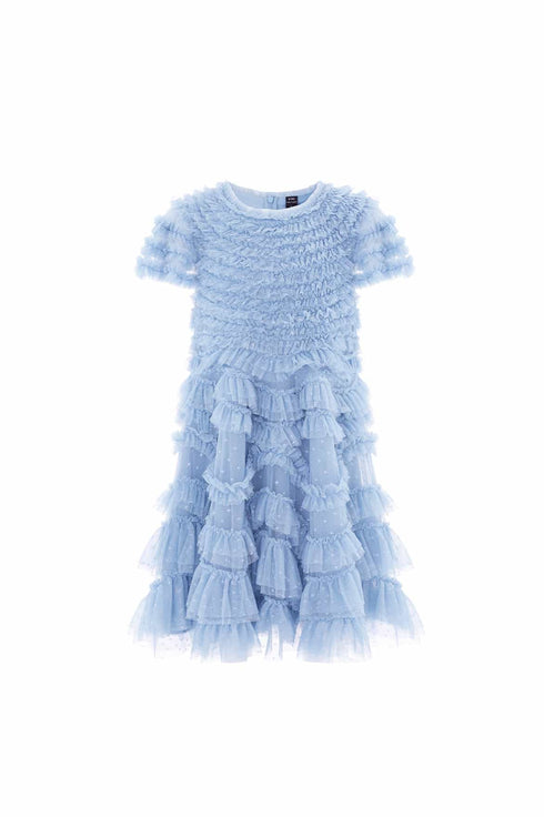 NEW SEASON. The Wild Rose Ruffle Kids Dress in Sky Blue is a signature Needle & Thread style, featuring textured ruffles and frills sewn in undulating patterns for a frothy look. Designed with layers of tulle and a sweeping hemline, it creates dramatic movement in the skirt—perfect for a mini-me moment.