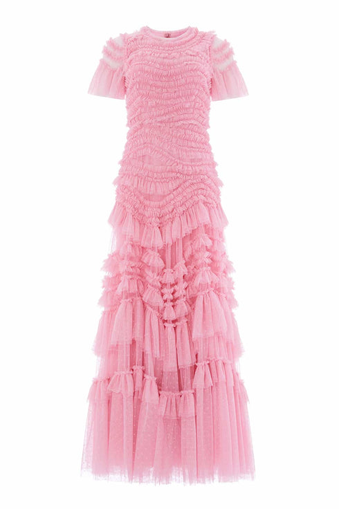 The Wild Rose Short Sleeve Gown in Sugar Pink features layers of ruffled tulle and intricate frill tiers, creating a breathtaking, voluminous silhouette. The net tulle skirt adds flattering fullness, making this show-stopping gown perfect for turning heads at any occasion.