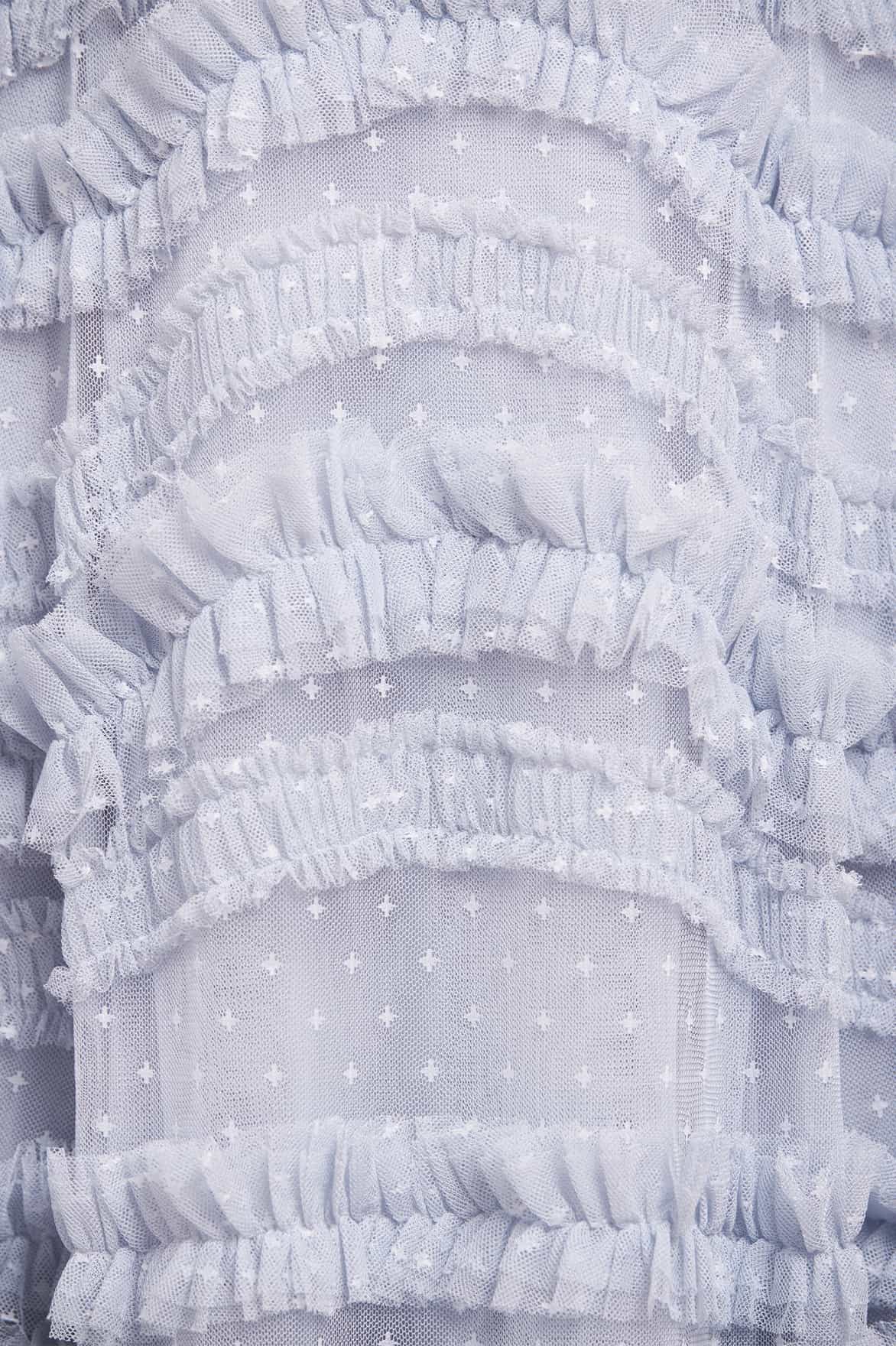 NEW SEASON. The Amara Ruffle Gown in Skylight. A true statement of romantic artistry. Crafted from layers of frothy tulle, the gown features curved bands of ruffles that flow gracefully across the body and cascade into a voluminous skirt, creating dramatic movement and charm.