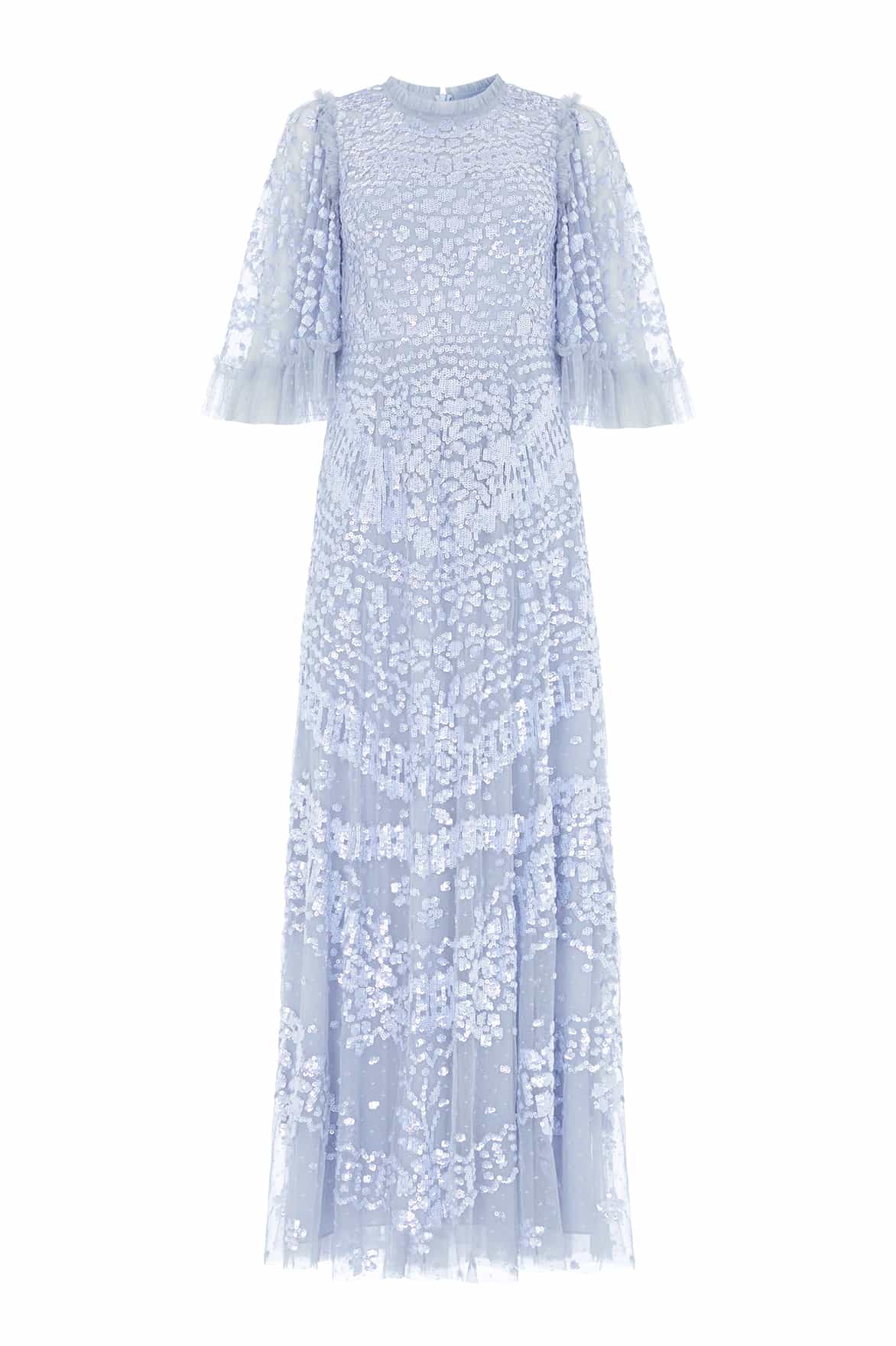 NEW SEASON. The Anais Sequin Gown in Skylight. A luminous statement piece inspired by vintage French lace. Crafted from soft tulle and adorned with shimmering sequins in a delicate border design, this gown features romantic circle-cut frills and fluttering sleeves for graceful movement and timeless allure.