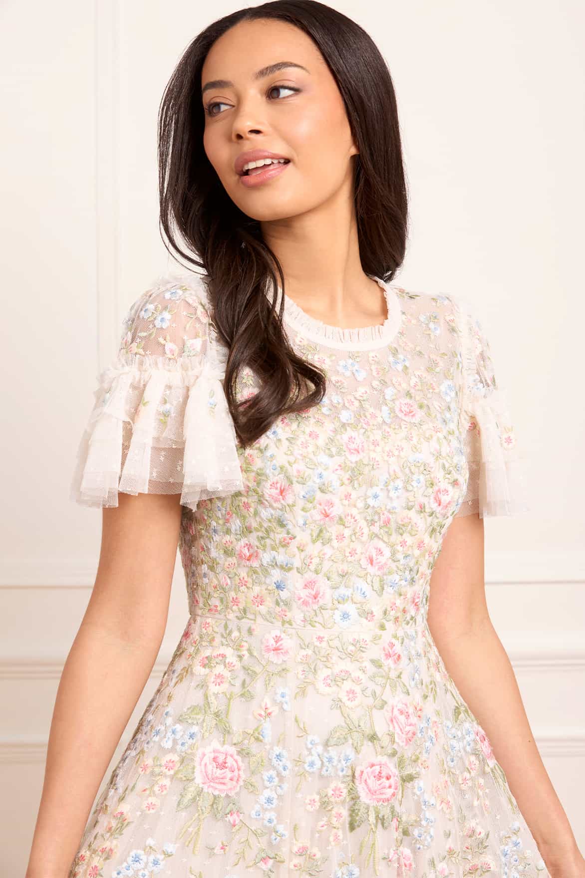 The Antoinettes Floral Round Neck Ankle Gown in Cream. A nod to the lavish beauty of Versailles, the Antoinette Gown showcases exquisite multicoloured floral embroidery, cascading in delicate clusters toward the hem. The round neckline is framed by signature Needle & Thread tulle ruffles, while short sleeves are finished with softly gathered tulle frills for a whimsical touch. Crafted with generous layers of net and tulle, the ankle-length skirt flows into a graceful, sweeping hemline—bringing timeless romance to any occasion.