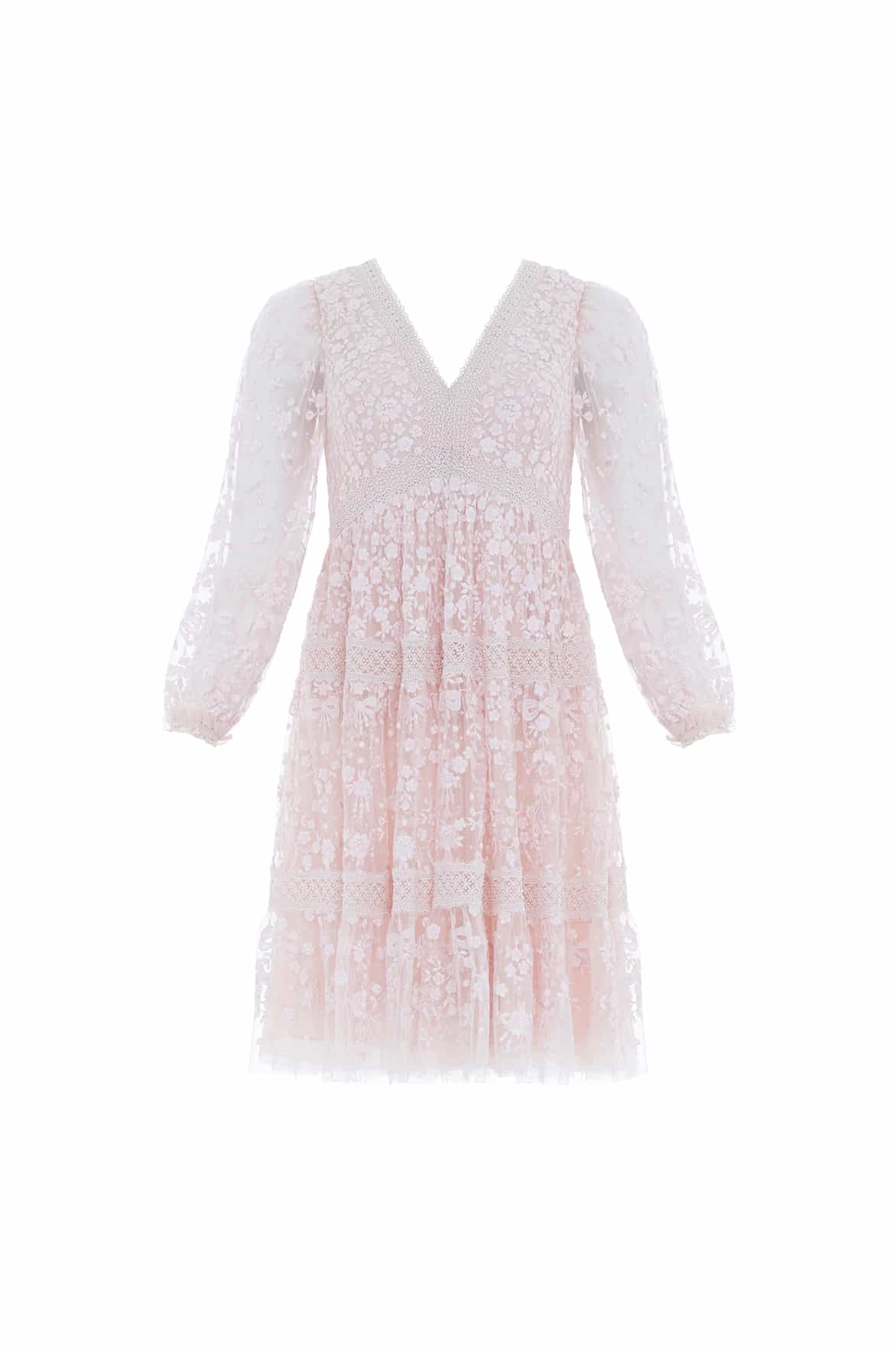 The Celestia Ribbon Mini Dress in Petal Pink / Pale Pink. This mini dress has been intricately designed with rich embroidery inspired by vintage lace, featuring delicate floral motifs and ribbon bows throughout. Crafted with pretty lace trims for signature Needle & Thread detailing, and delicately constructed with a textured tulle fabric base. Featuring a V-shaped neckline and a new, ultra-flattering silhouette. Make the ultimate statement in the Celestia.