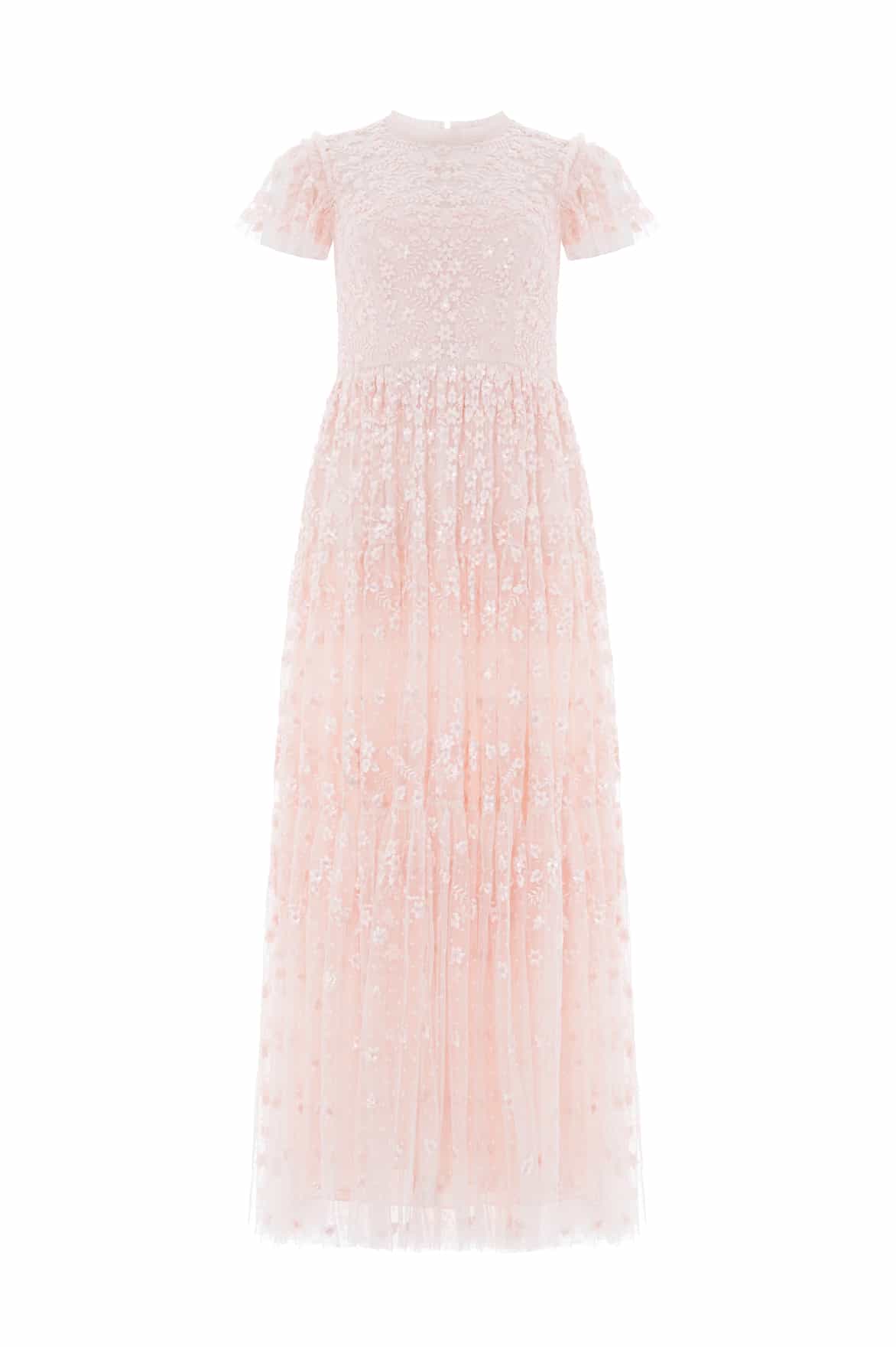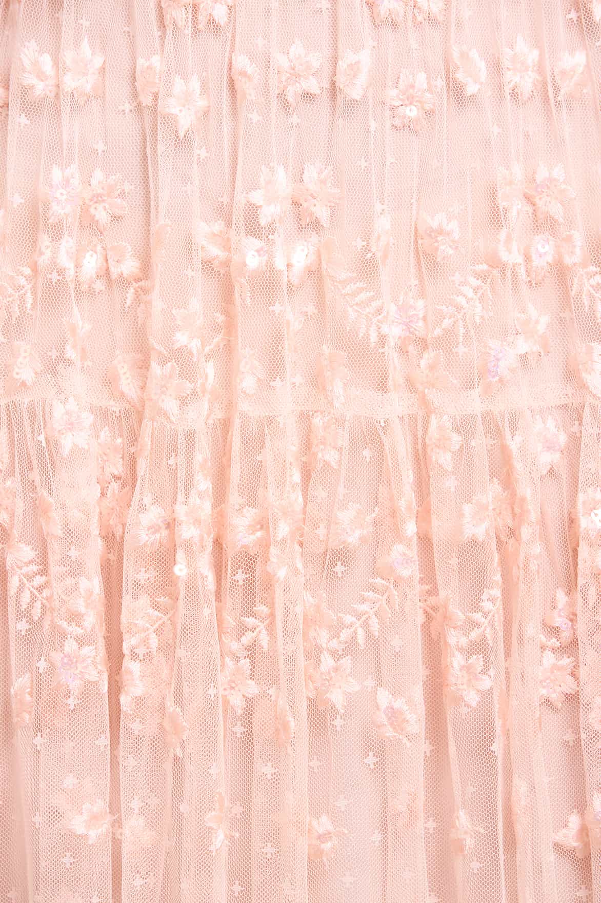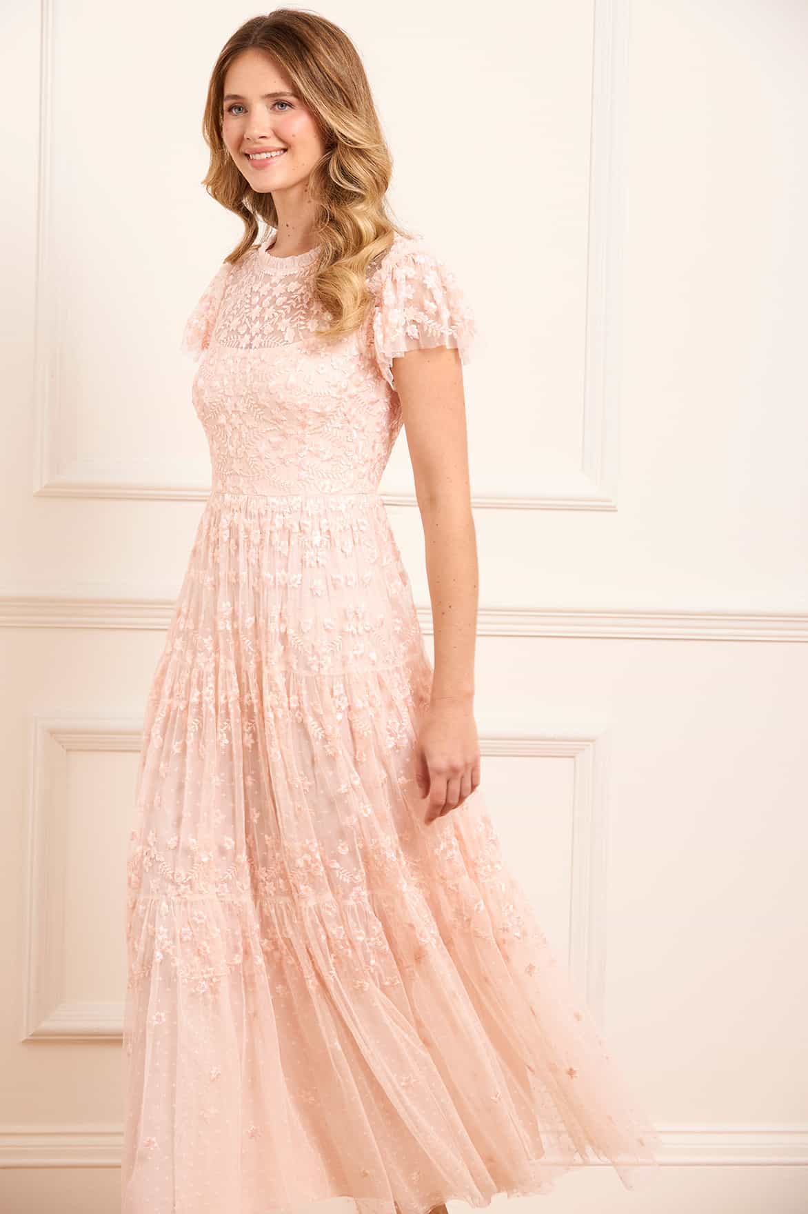 The Clover Short Sleeve Ankle Gown in Opal. Features intricate clover-inspired embroidery, delicately placed across layers of soft tulle. Designed to create a light, ethereal feel, this gown offers gentle movement and a flattering silhouette.