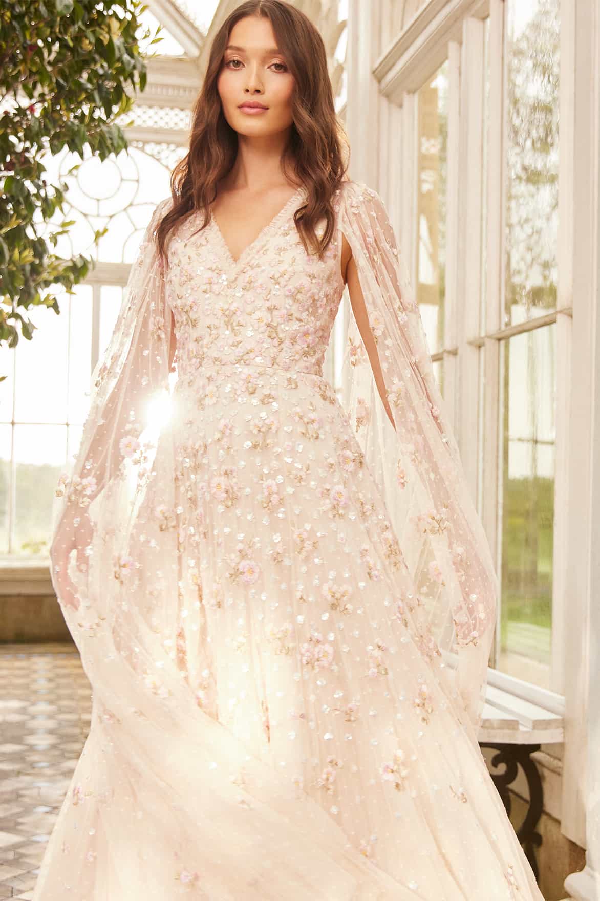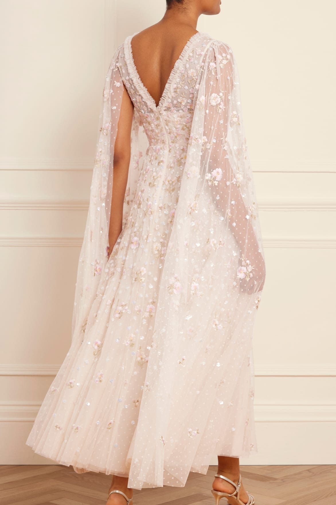 The Dahlia Ditsy Ankle Gown in Cream. This gown is beautifully decorated with shimmering silver sequins in delicate dot motifs and intricate floral embroidery in pastel pink tones. Featuring our new floor-length cape for romantic detailing. Developed with layers of net and tulle for a full and voluminous skirt. The perfect statement style for a special occasion.